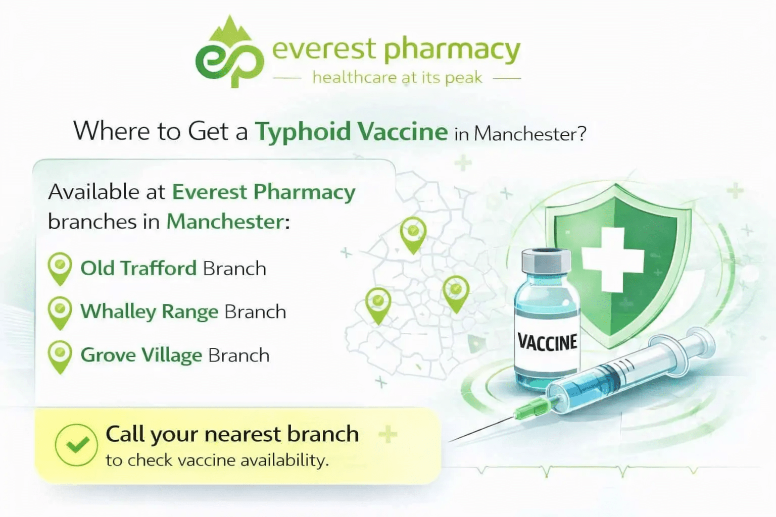 Yes. A private typhoid vaccine in Manchester is available through registered travel clinics and specialist pharmacies. Everest Pharmacy provides both injectable and oral typhoid vaccine options following a pre-travel health consultation.